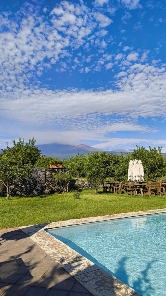 Unsere Unterkunft liegt am Fuße des Vulkans, eingebettet in einen riesigen Garten voller Zitronenbäume und leuchtendem Hibiskus. Das Agritourismo ist familiengeführt, kleine Katzenbabies spielen auf dem Hof, Oliven werden geerntet. Morgens sitzen wir beim Frühstück, streichen hausgemachte Zitronenmarmelade aufs Brot und schauen hinauf zum Ätna – ein Ort, an dem man ganz automatisch langsamer wird.