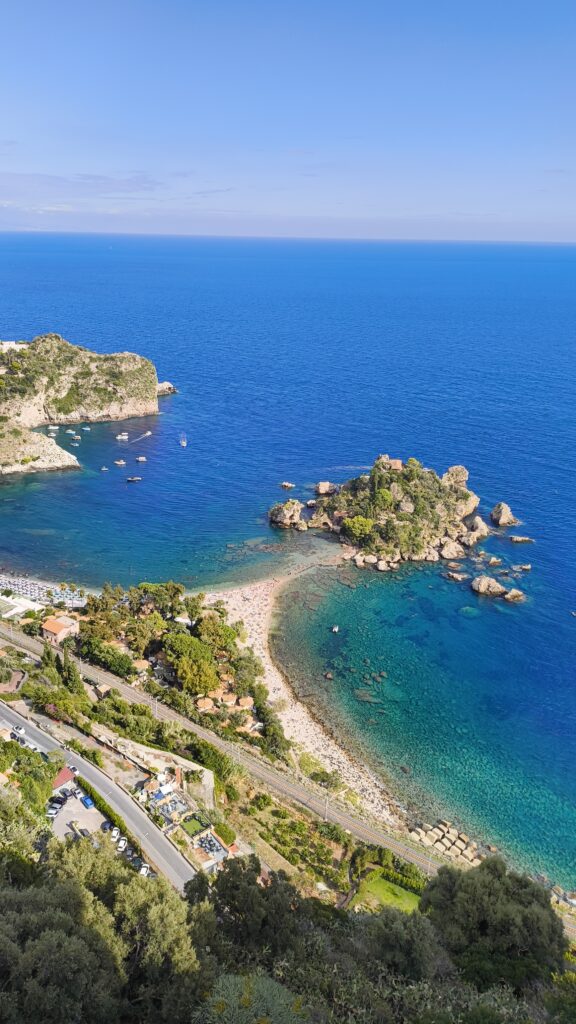 Gestärkt machen wir uns auf den Weg nach Taormina. Die Sonne lacht, und statt direkt ins Zentrum zu gehen, entscheiden wir uns für den Aufstieg nach Castelmola. Über mehrere Treppen überwinden wir rund 285 Höhenmeter, begleitet von immer neuen Ausblicken: auf die Küste, die Isola Bella und hinüber zum italienischen Festland.