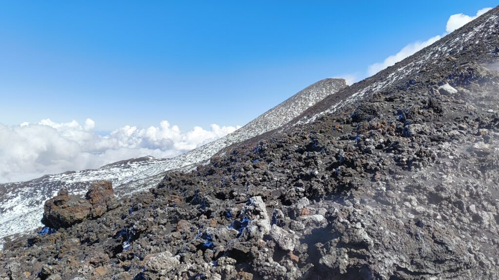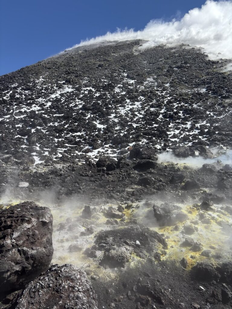 Auf rund 2.800 Metern heißt es dann: warm anziehen. Zu Fuß erklimmen wir mehrere Krater, laufen über Schnee, Eis und erkaltete Lava, vorbei an dampfenden, nach Schwefel riechenden Stellen. Unser Guide ist großartig, führt die kleine Gruppe geschickt an, erzählt spannende Informationen über Geographie und Geologie. Die Landschaft um uns herum ist roh, archaisch und beeindruckend – alleine hätten wir uns hier nicht orientieren können. Über die Bocca Nuova geht es weiter hinauf bis auf etwa 3.030 Meter zum Krater des Cratere Nord-Est.