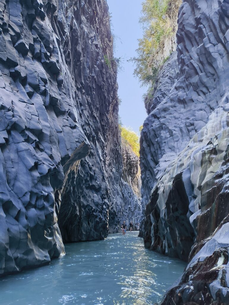 Auf Empfehlung unseres Guides fahren wir am nächsten Tag weiter zur Alcantara-Schlucht. Idyllisch gelesen zwischen Bergketten und kleinen Dörfern haben hier mehrere Lavaströme ein spektakuläres Flussbett aus Basaltsäulen und kleinen Wasserfällen geformt. Mutig steigen wir ins eiskalte Wasser und erkunden die enge Schlucht – ein echtes Naturabenteuer. Parkplatz und auch Eintrittskasse kann man von der Straße kaum übersehen.